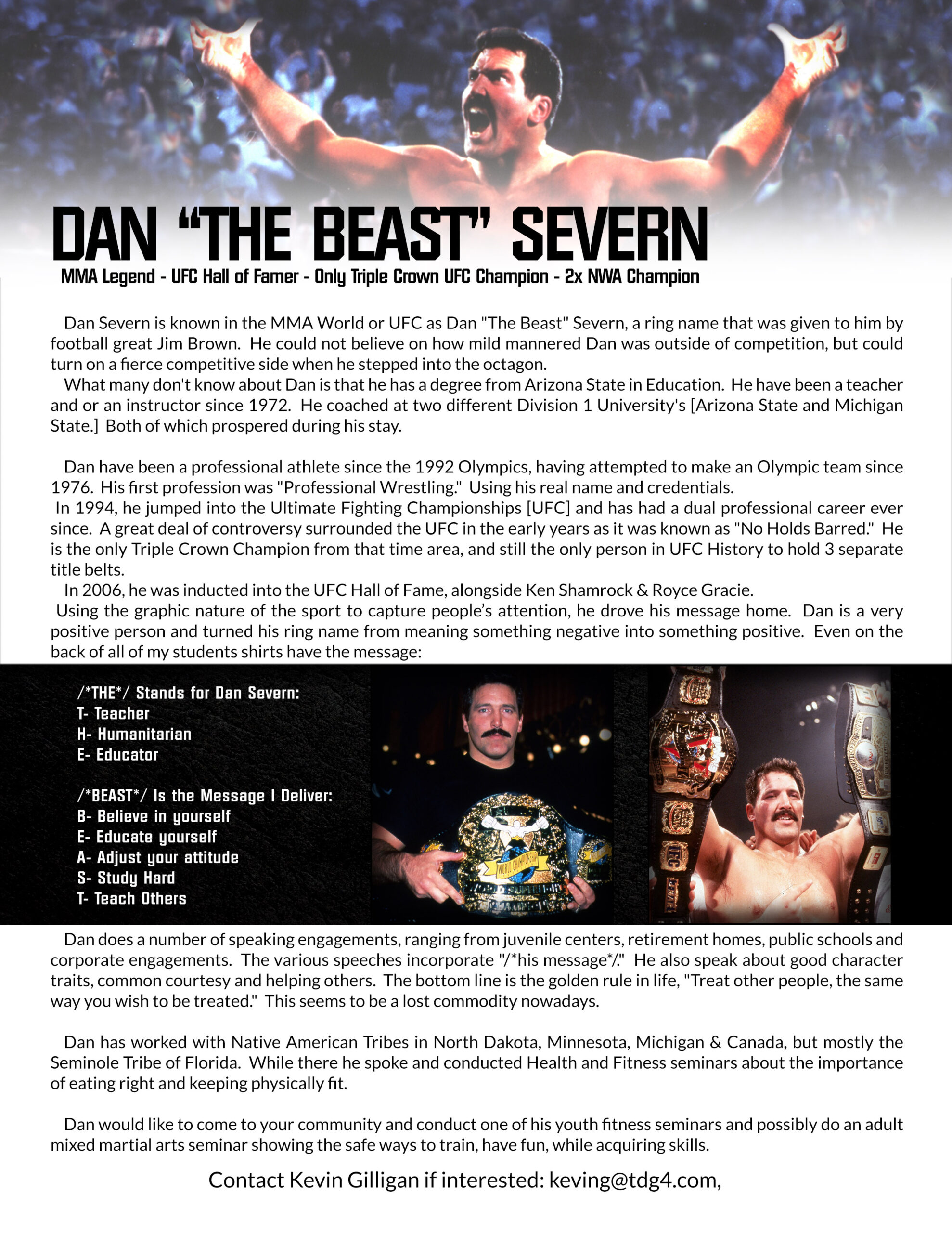دان سيفيرن هو رجل عصر النهضة الحقيقي, رائد الفنون القتالية المختلطة, والمفضل لدى المعجبين بلا منازع. بطل التاج الثلاثي الوحيد في UFC, وتم إدراجه في قاعة مشاهير UFC وقاعة مشاهير المصارعة في ولاية أريزونا. وهو أيضا مؤلف, محاضر, نجم سينمائي, ممثل تلفزيوني, معلق MMA, ومعلم مشهور لمصارعة التقديم.