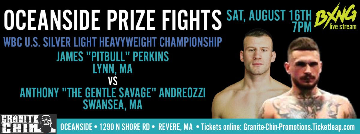 | James Perkins vs. Anthony Andreozzi title fight, plus undefeated prospects Shea Willcox & Джэймс Perella Жнівень 16 at Oceanside Events Center in Revere, Масачусэтс |