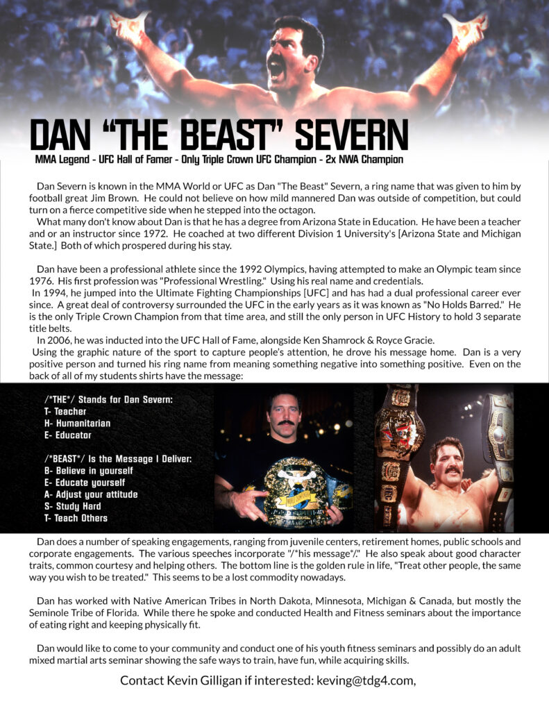 One of the most significant advantages of booking Dan Severn is his willingness to go above and beyond to ensure the event’s success. He offers a wide range of promotional and community engagement activities that can be scheduled around the seminar to generate buzz and help offset the costs.