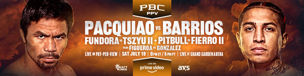 பேக்குயோ எதிராக. Barrios will see Hall of Fame boxing legendManny “Pacman” Pacquiaoand WBC Welterweight World ChampionMario “El Azteca” Barriossquare off in the main event of a star-studded PBC Pay-Per-View event on Prime Video on Saturday, ஜூலை 19 லாஸ் வேகாஸ் நகரில் உள்ள MGM கிராண்ட் கார்டன் அரங்கில் இருந்து.