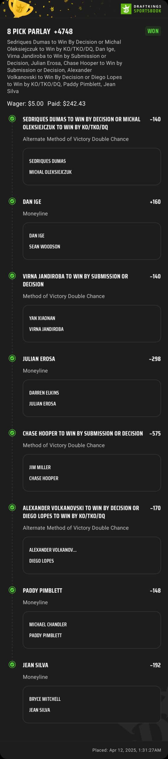 I am by no means a professional gambler. I needed all the help I could get when I first signed up for ವಿಪರ್ಯಾಸ. One way I limit my losses is by only betting $5 on each wager and trying to stick to sports I know well. Although most professional gamblers with huge bankrolls advise staying away from parlays, that’s how I capitalize on my $5 personal bet limit. Here are just a few of my biggest wins since I started using Oddsjam: